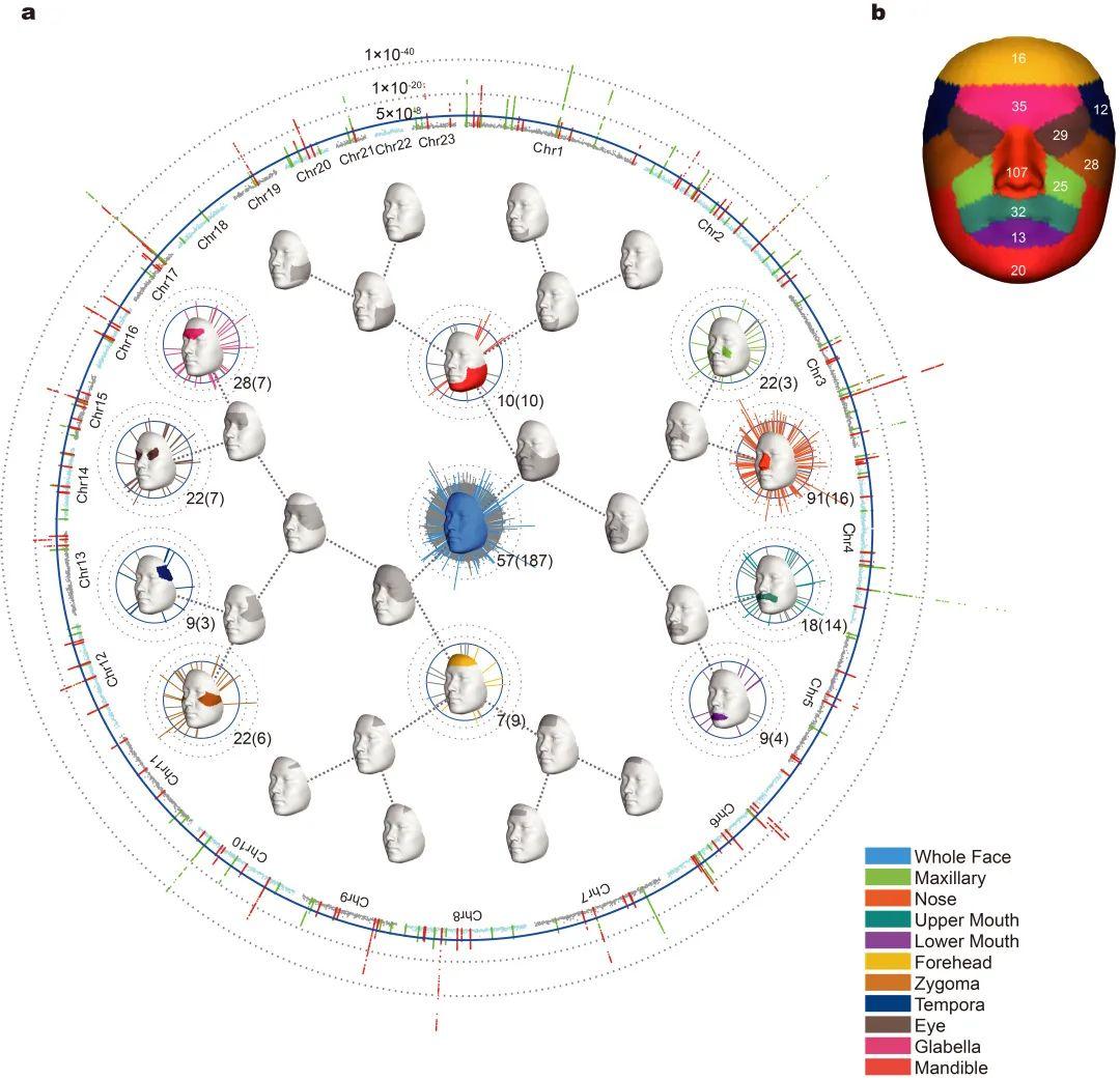 研究人员基于大量的3D人脸图像,构建了一套结合解剖学信息的面部分割方法。他们定位了244个影响东亚群体头面部形态的遗传变异,证实面部特征作为典型的复杂性状由多基因共同影响。通过与欧洲团队合作,研究人员进一步发现亚欧差异信号可能是功能同质,因频率变化而造成的。研究人员分析发现,影响面部形态的相关遗传位点也影响着体成分、体质和毛发等其他人体表型特征。
