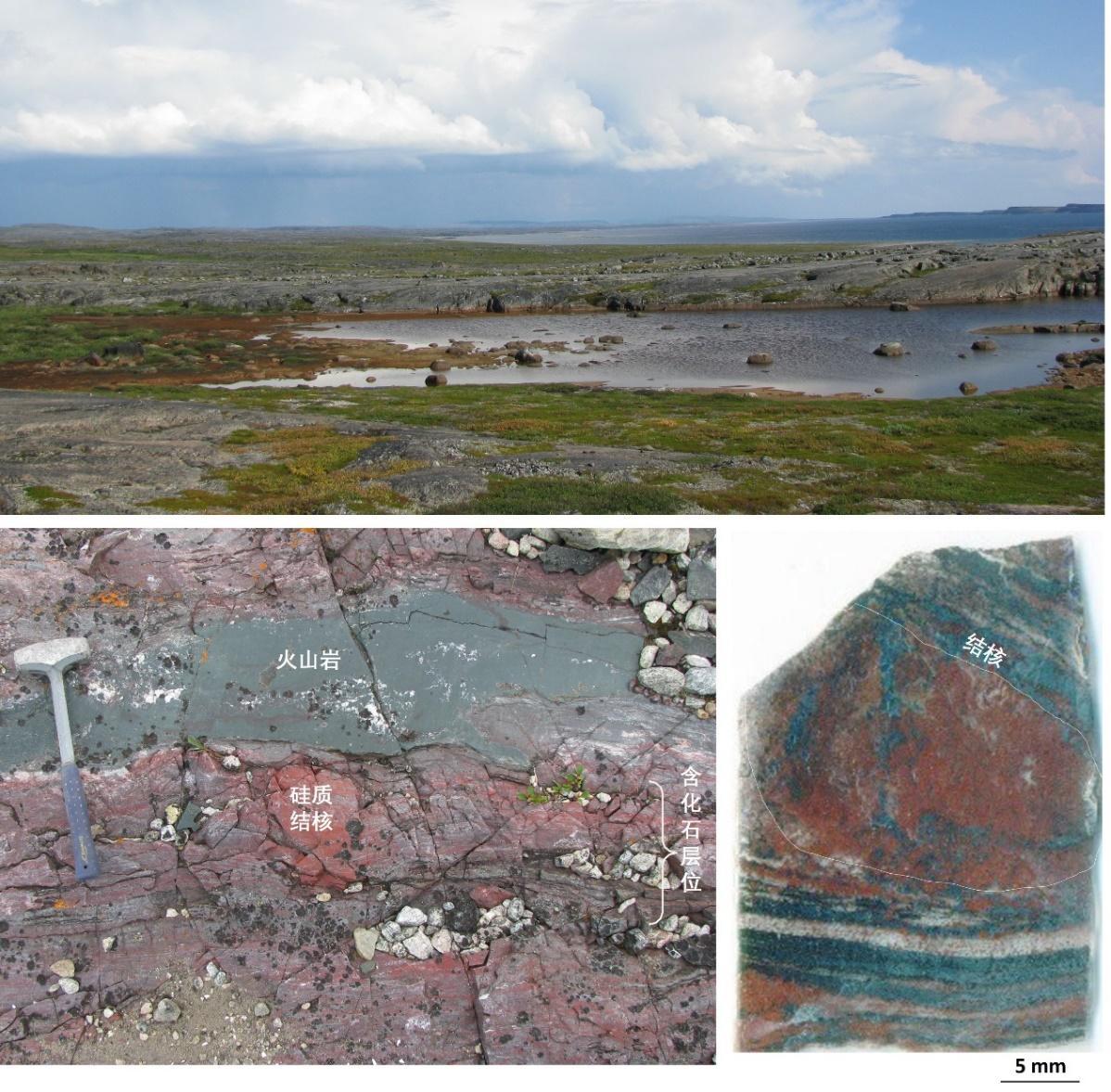 加拿大魁北克NSB表壳岩野外景观(上图)、产化石的含铁岩石(左下)及其切片(右下)