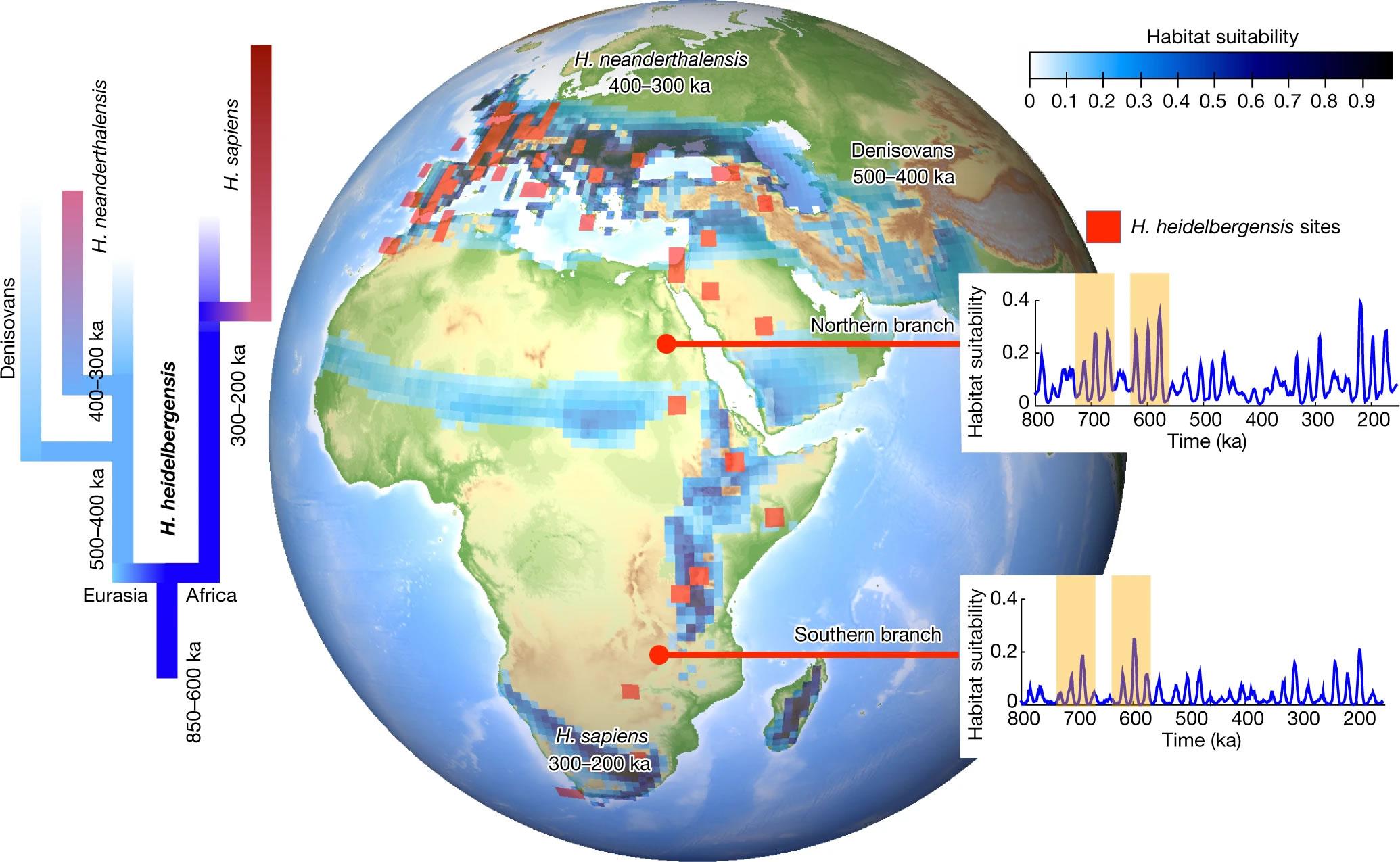 这项研究产生了大量令人眼花缭乱的数据,并形成了几个有趣的模式。例如,研究人员的分析表明,早期人类物种海德堡人大约在70万年前开始扩大其栖息地。一些科学家认为,这个物种可能在全球范围内产生了许多其他物种,包括欧亚大陆的尼安德特人和非洲某地的智人。