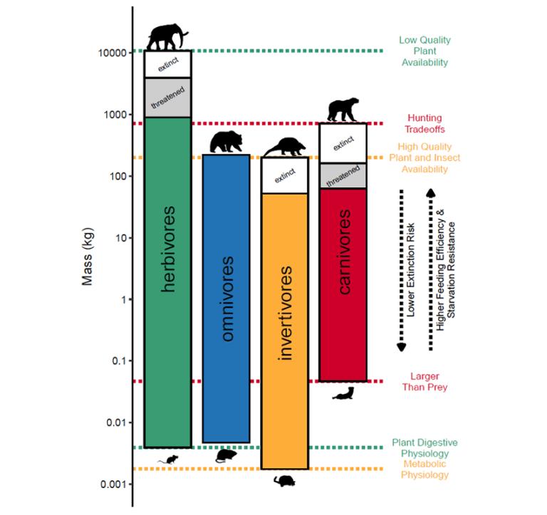 由于食草动物以植物为基础的饮食营养相对较差,它们往往为了覆盖更多的地面以觅取更多的食物而长得很大,并容纳长而复杂的消化道,以便从中提取最大的营养。与此同时,食肉动物必须长得足够大,才能跟上并击倒那些食草动物。尽管杂食动物的自助餐式的菜单通常能使它们的肚子饱满,但它们的高能量需求通常使它们专注于坚果、昆虫和其他小的、能量密集的食物。虽然无脊椎动物大多喜欢吃富含蛋白质的猎物,但这些猎物的体积很小,再加上许多其他无脊椎动物的激烈竞争,使它们只能吃到最小的尺寸。