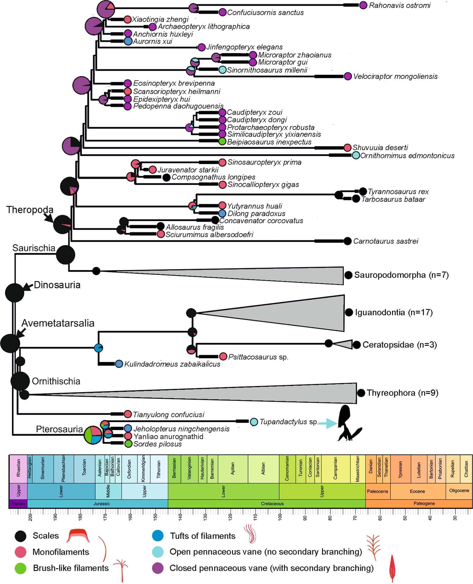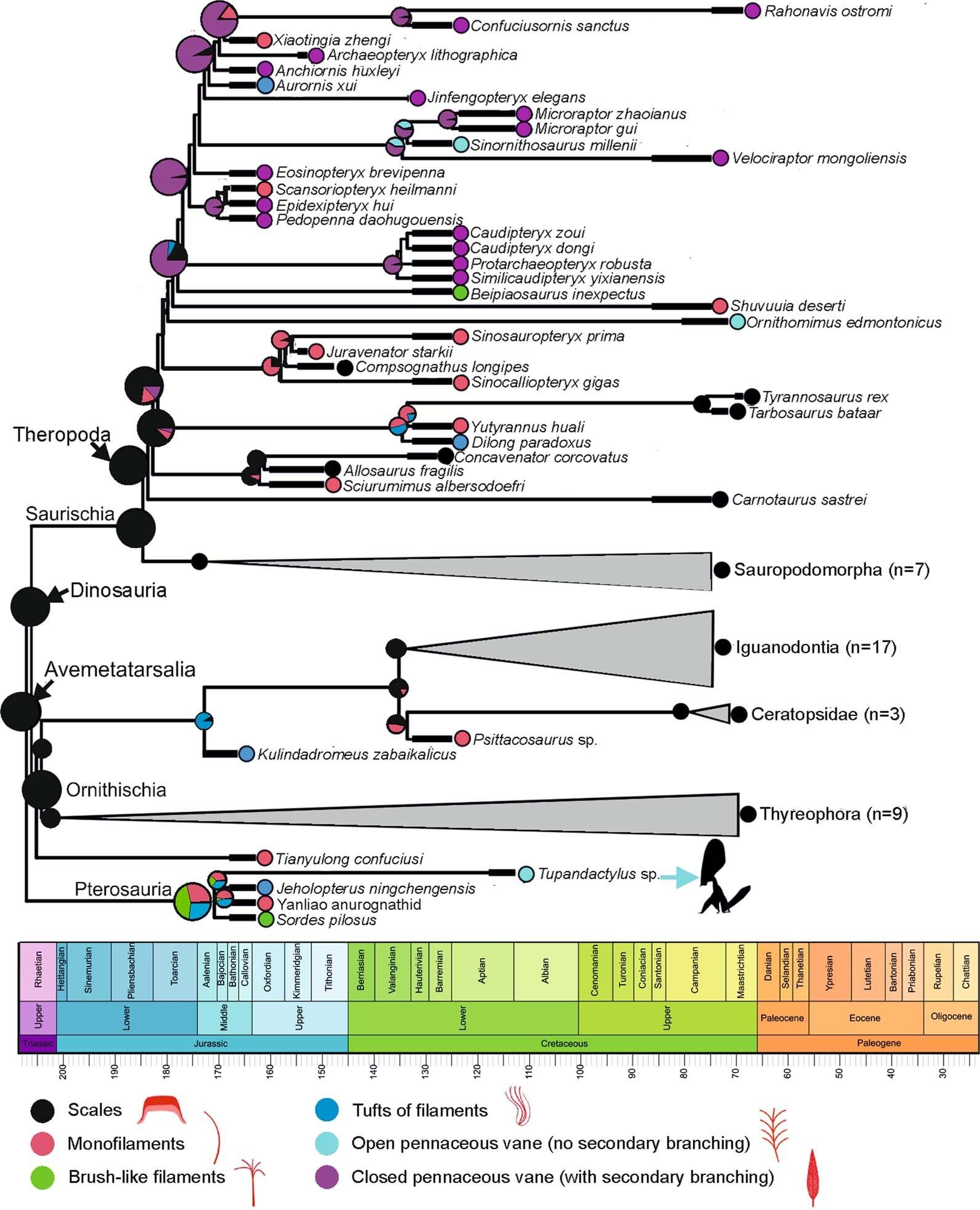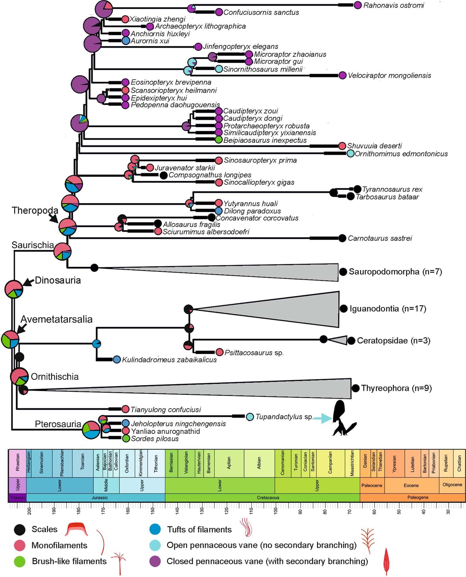 研究人员在4月20日发表于《自然》的论文中,强化了翼龙“毛茸茸”的观点,并指出有些翼龙的羽毛可能有复杂的彩色图案。巴西ABC联邦大学古生物学家Rodrigo Pêgas虽然觉得这非常奇妙,但他并不赞同羽毛起源有McNamara认为的那么早。其他一些研究人员甚至怀疑这根本不是羽毛。