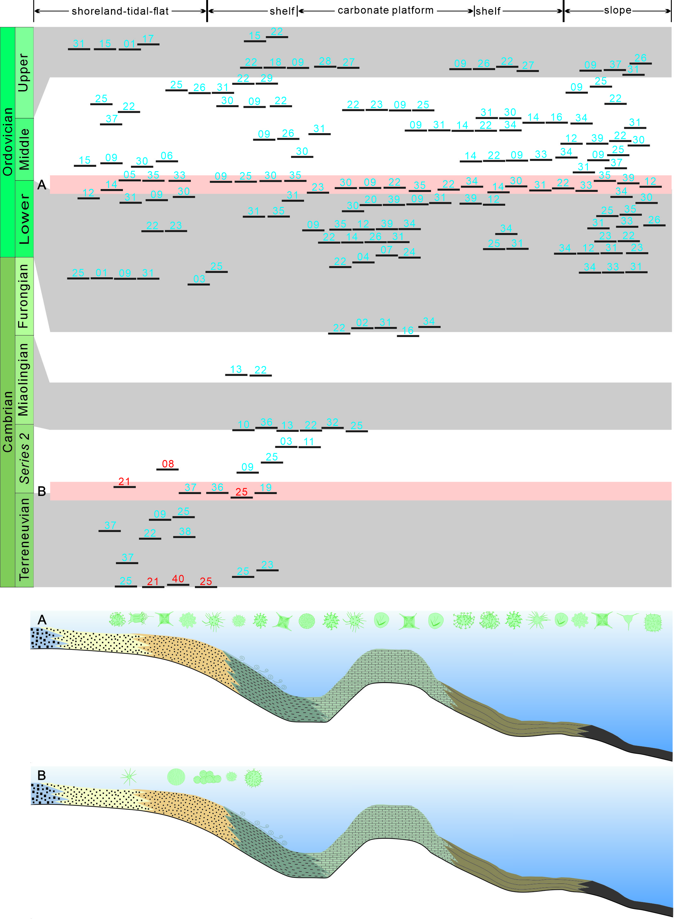在这项研究中,作者以相对丰度为标准,最终选取了 40 多种优势形态类型,涉及华南、华北以及塔里木三大板块的 60 多个剖面。将选取的疑源类优势类群按照其古环境分布进行投图,结果发现,疑源类生物的生态空间在寒武纪到奥陶纪期间存在从近岸环境向远离海岸方向拓展的趋势,并且在寒武-奥陶纪界线附近的转变最为显著。该发现为“奥陶纪浮游生物革命(Ordovician plankton revolution)”的开始与发展提供了证据。