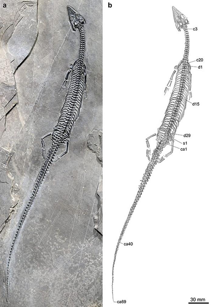 论文第一作者和通讯作者徐光辉研究员接受中新社记者专访指出,这件长尾红河龙化石标本保存非常完整,经过专业修理后非常清晰,它发现于云南省红河州泸西县中三叠世早期(约2.44亿年前)海相地层,全长47厘米,体形像水生蜥蜴,其超长的尾巴尤其特别,比它身体其他部分要长。