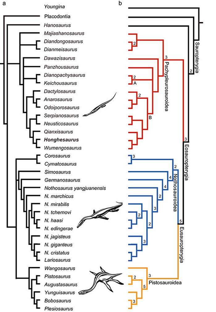 他介绍说,二叠纪末(约2.52亿年前)生物大绝灭之后,海洋生态系统在三叠纪发生重大变革,爬行动物在海洋环境中辐射演化,形成以鱼龙类、海龙类和鳍龙类等为代表的海生爬行动物支系,其中鳍龙类就包括楯齿龙类、肿肋龙类、幻龙类和蛇颈龙类。早在1854年,肿肋龙类化石就发现于欧洲阿尔卑斯中三叠世海相地层。这些欧洲肿肋龙类共分为五属,都归入肿肋龙科。