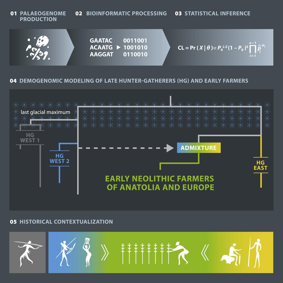Excoffier团队发现,古代安纳托利亚农民是欧洲和中东不同狩猎采集群体反复混合诞生的后代。这些群体最初是在约2.5万年前最后一个冰河时代时高度分化的。模型显示,西方的狩猎采集群体几乎灭绝,随着气候变暖又有所恢复。