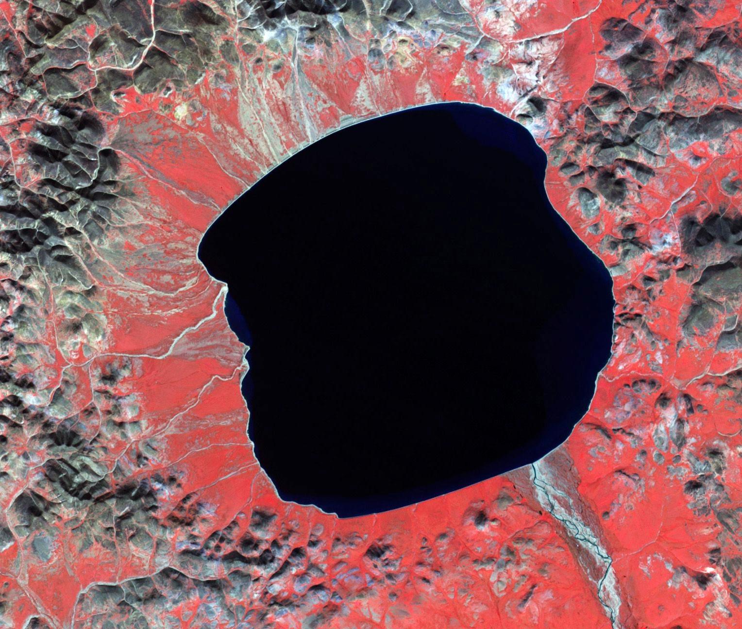 El'gytgyn湖的假彩色图像,由美国宇航局Terra卫星上的高级星载热发射和反射辐射计(ASTER)于2008年8月18日拍摄(红色表示植被,灰褐色表示裸露的土地,深蓝色表示水)