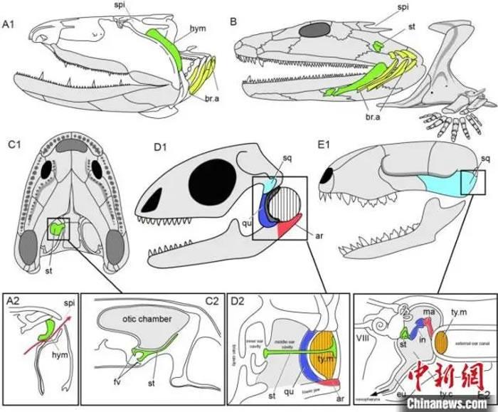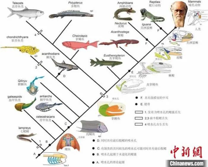盖志琨表示,在化石证据破解百年科学难题的基础上,研究团队明确提出喷水孔从无颌类到四足动物的演化历程,从而建立起喷水孔从无颌类的鳃到人类中耳的演化序列: