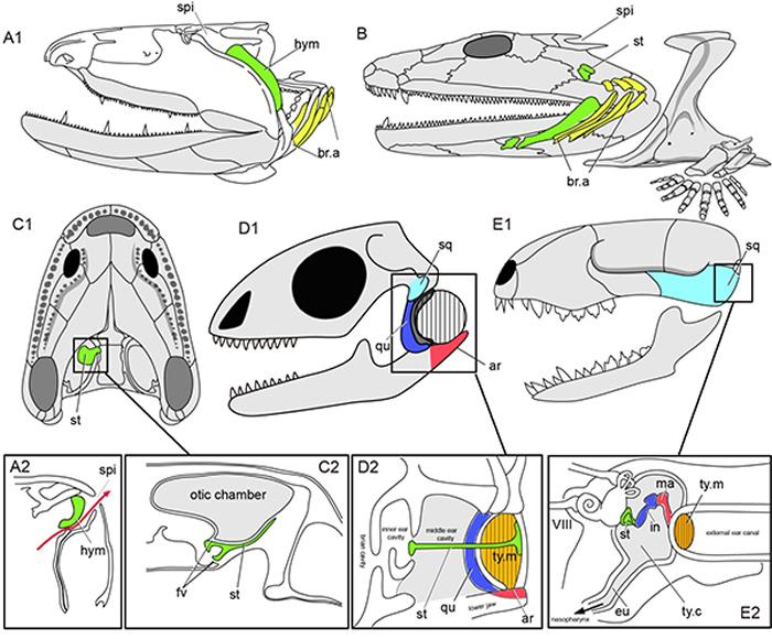 图6 鱼类喷水孔向人类中耳演化的四个阶段。A. 真掌鳍鱼及其喷水孔切面;B. 棘螈;C. 鱼石螈及其中耳切面; D. 爬行动物及其中耳切面; E.哺乳动物及其中耳切面(A-E,来自Gai et al. 2022,史爱娟绘)