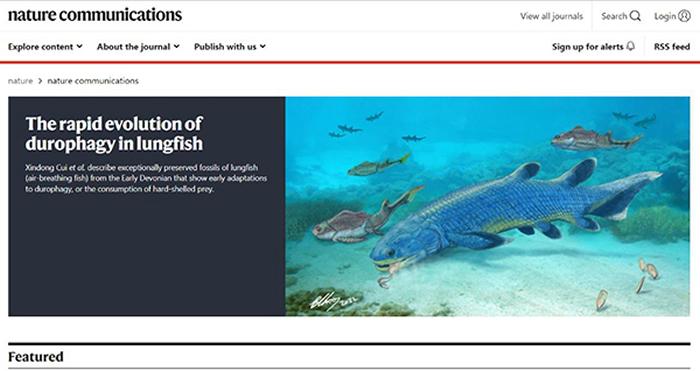 《自然 通讯》官网首页置顶推荐古脊椎所朱敏院士团队肺鱼食性演化研究成果