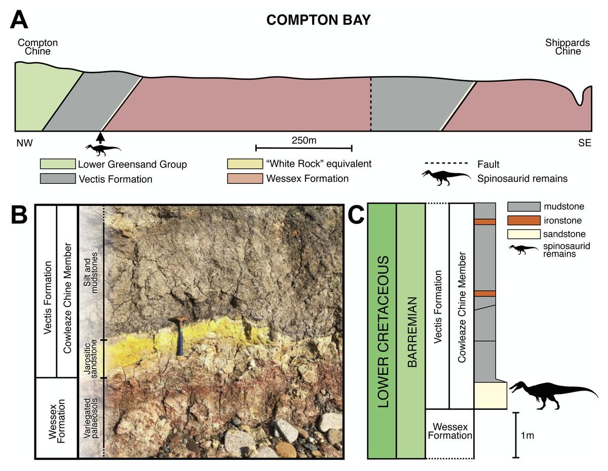 “白石棘龙”因其被发现的地质层而得名,它是通过其巨大的骨盆和尾椎的化石以及其他一些恐龙碎片被确认的。由南安普顿大学的研究人员领导的团队本周在《