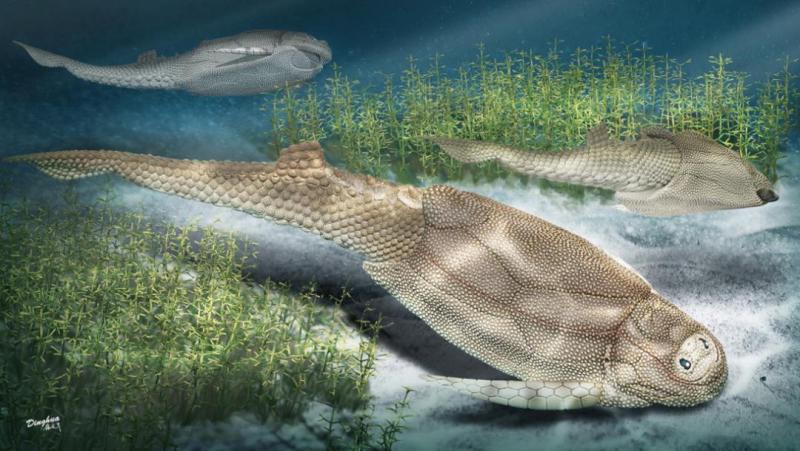 胴甲鱼类是盾皮鱼类最原始的分支,处于有颌脊椎动物演化的根部,是一类外形非常奇特的鱼类。它们两眼和鼻子挤在头顶的一个“天窗”内,躯体前半部分被箱形膜质骨甲所覆盖,特别是一对胸鳍也被坚硬的骨片包裹,比起鱼鳍,看上去更像节肢动物的附肢。