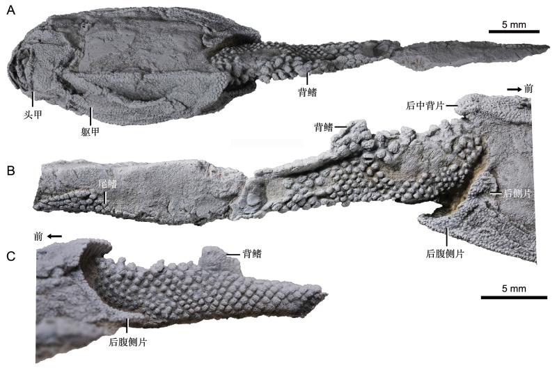 大多数现生鱼类从头至尾完全被鳞片覆盖,但远古的鱼类却并非一直如此。在大约4.1亿年前的海洋中,生活着一大群“披盔戴甲”的鱼类,这就是属于盾皮鱼类的胴甲鱼类,它们的躯体前半部分覆盖有大块的外骨骼骨片,后半部分则覆盖着鳞片,或具有裸露的皮肤。这些古代鱼类是有颌类最早分化出来的一个支系,因此引起科学家们极大研究兴趣。不过,学界对胴甲鱼类的了解,特别是对其早期成员鳞片形态和结构的认知,此前仅局限于一些零散材料提供的信息。