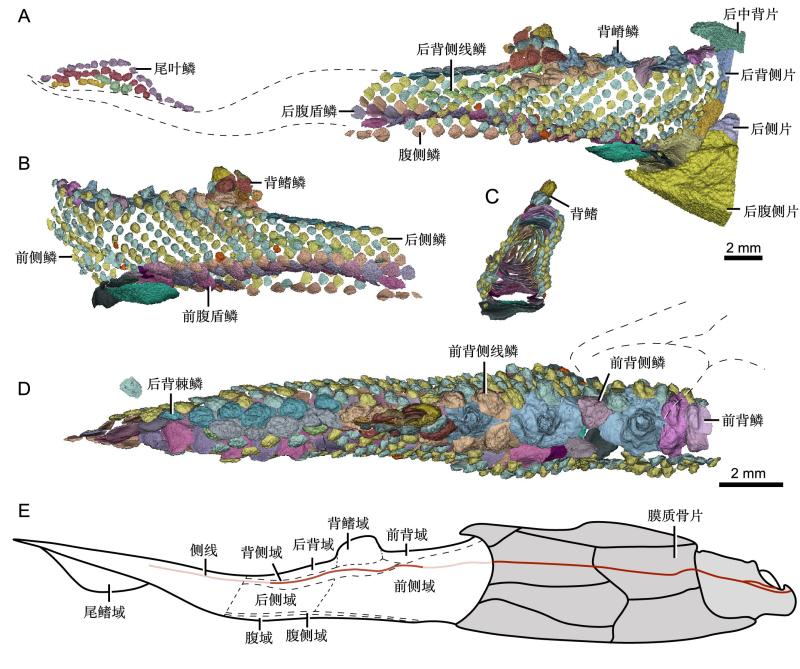 研究团队使用高精度计算机断层扫描(MicroCT)技术,对西屯副云南鱼正模保存的鳞列进行了详细重建,获得迄今最完整的胴甲鱼高清鳞列及鳞片三维形态。