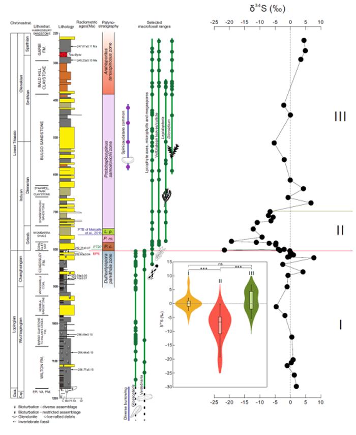 研究团队对1000多米长的钻孔和相关地层进行了详细的测量和多种数据分析,首先精确地确定了陆相生物在悉尼盆地灭绝的层位,年龄数据表明悉尼盆地陆地生物的灭绝要早于全球海洋生物灭绝事件大约20-60万年。在此基础上研究团队对钻孔样品中的黄铁矿开展了高精度硫同位素测试。研究发现,硫同位素在陆相生物灭绝层位发生了巨大的波动变化(如图)。具体表现为三个阶段,灭绝前(第I阶段)的硫同位素变化范围较小,但在陆地生命灭绝时期(第II阶段)硫同位素发生非常显著的降低,灭绝发生以后(第III阶段)硫同位素的分布与灭绝前基本一致。