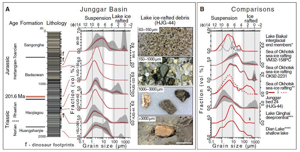 但此次,研究团队首次在准噶尔盆地晚三叠世至早侏罗世深湖相泥岩中发现了冰筏沉积。研究人员分析,冰筏沉积可能是由于冬季靠岸湖水结冰时冻结湖底的砂砾,春季湖冰融化,一部分冰携带冻结的砂砾漂浮至湖中央,至完全融化后将其释放而沉积于深湖泥中;也有可能是冬季风将陆地上的砂砾吹至冰面,春季湖冰融化,砂砾落入深湖泥中。