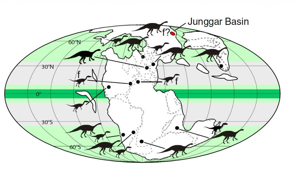 晚三叠世准噶尔盆地古地理位置及恐龙分布图