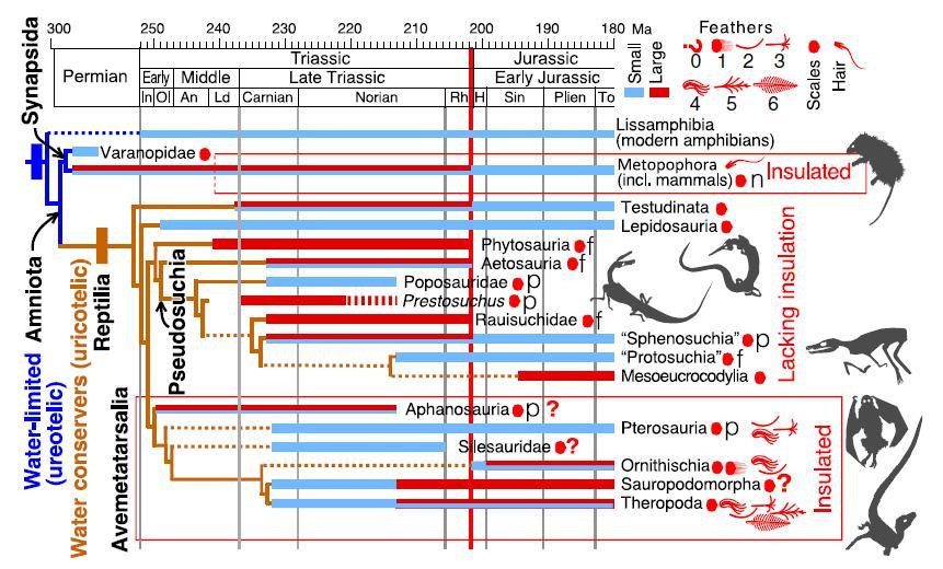 根据系统发育支架法,研究团队推断恐龙天生具有羽毛,但是这些羽毛不是用于飞翔的,而是用于保温的。三叠纪末生物灭绝事件之前,恐龙尤其是食草性的恐龙主要分布在中、高纬度地区,而低纬度地区则以食草性和食肉性的拟鳄类为主。研究团队认为,具有保温功能的原始羽毛能确保食草性恐龙抵御中、高纬度的冷冬,进而独享中、高纬度丰富且稳定的植物资源。在低纬度地区植物资源多变且不稳定,恐龙因较高的新陈代谢速率而无法竞争过新陈代谢速率较低的假鳄类。假鳄类因没有羽毛御寒也无法去到中、高纬度地区。