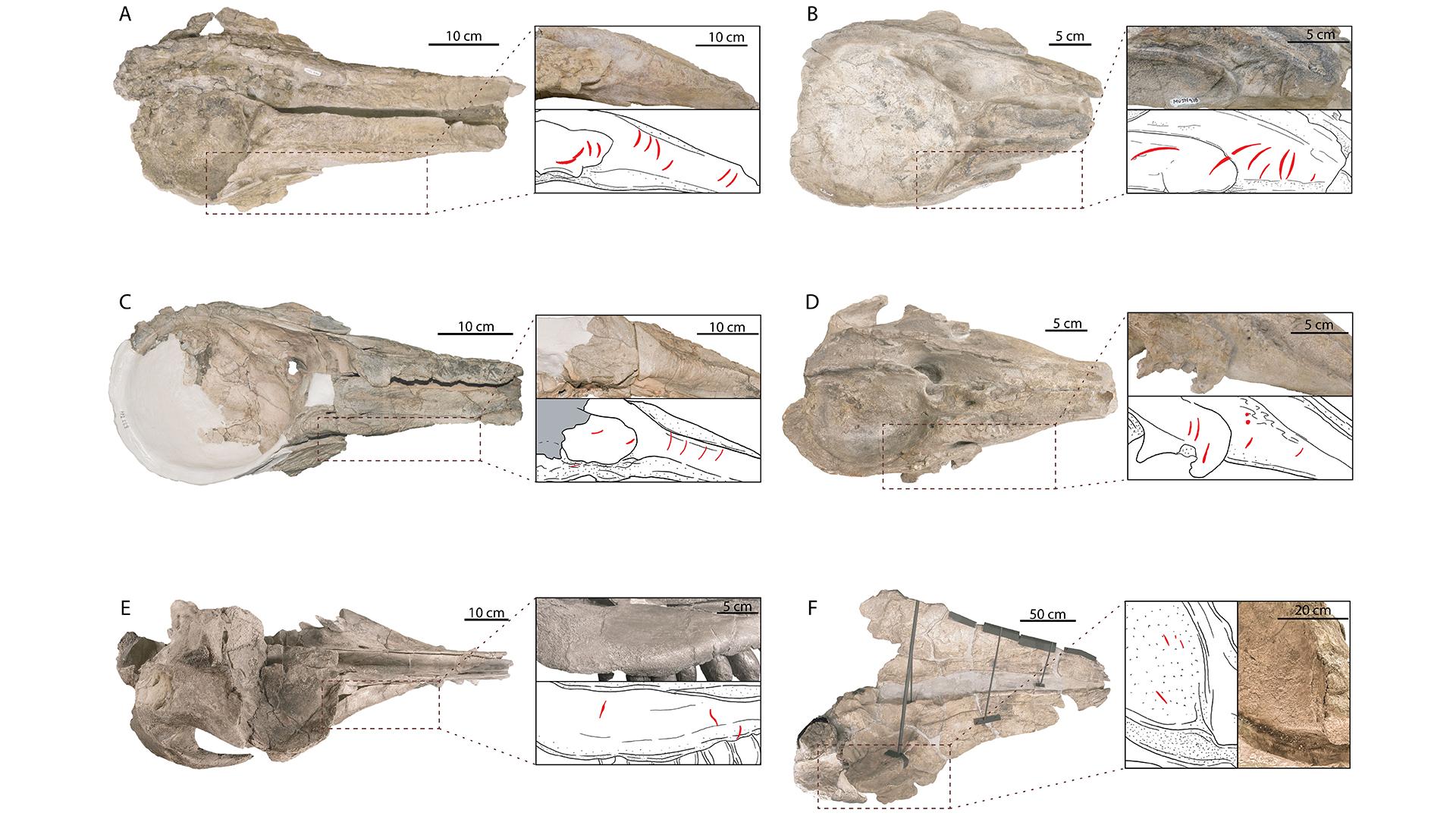 咬痕的大小和形状的变化说明,这些头骨曾被不同品种的鲨鱼咬过。他解释说,带一点锯齿的大型咬痕是“典型的巨齿鲨”,而看上去像被尖刀划过的深痕“可能是马可鲨或沙鲨。深度介于二者之间、带有不规则锯齿的,最有可能来自白鲨家族”。