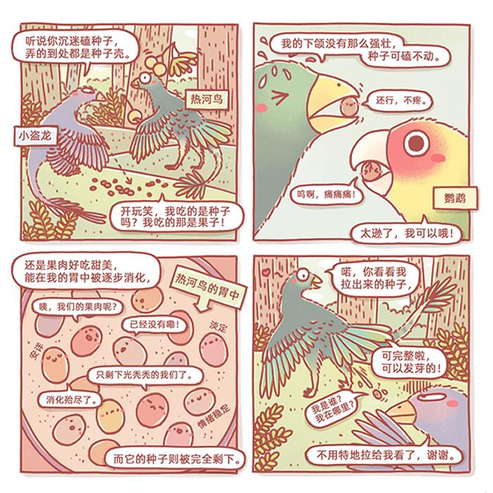 由此,研究人员认为热河鸟实为至少季节性的食果鸟类,因此也是鸟类食果这一生态习性的最早化石记录。食果意味着植物的种子可以完整留存排出,因此食果鸟类具有传播种子的功能。这一热河鸟的新研究显示鸟类在演化的最初阶段,很可能就已经扮演了植物传种媒介这一角色。作为具有一定飞行能力而移动范围大为增加的传播者,早期的食果鸟类很可能协助了结果植物的扩张,而果实这一优质食物也可能扩大了早期鸟类的演化可能性——鸟类和植物间的相互作用可能在白垩纪陆地革命中有着有待进一步探索的重要地位。
