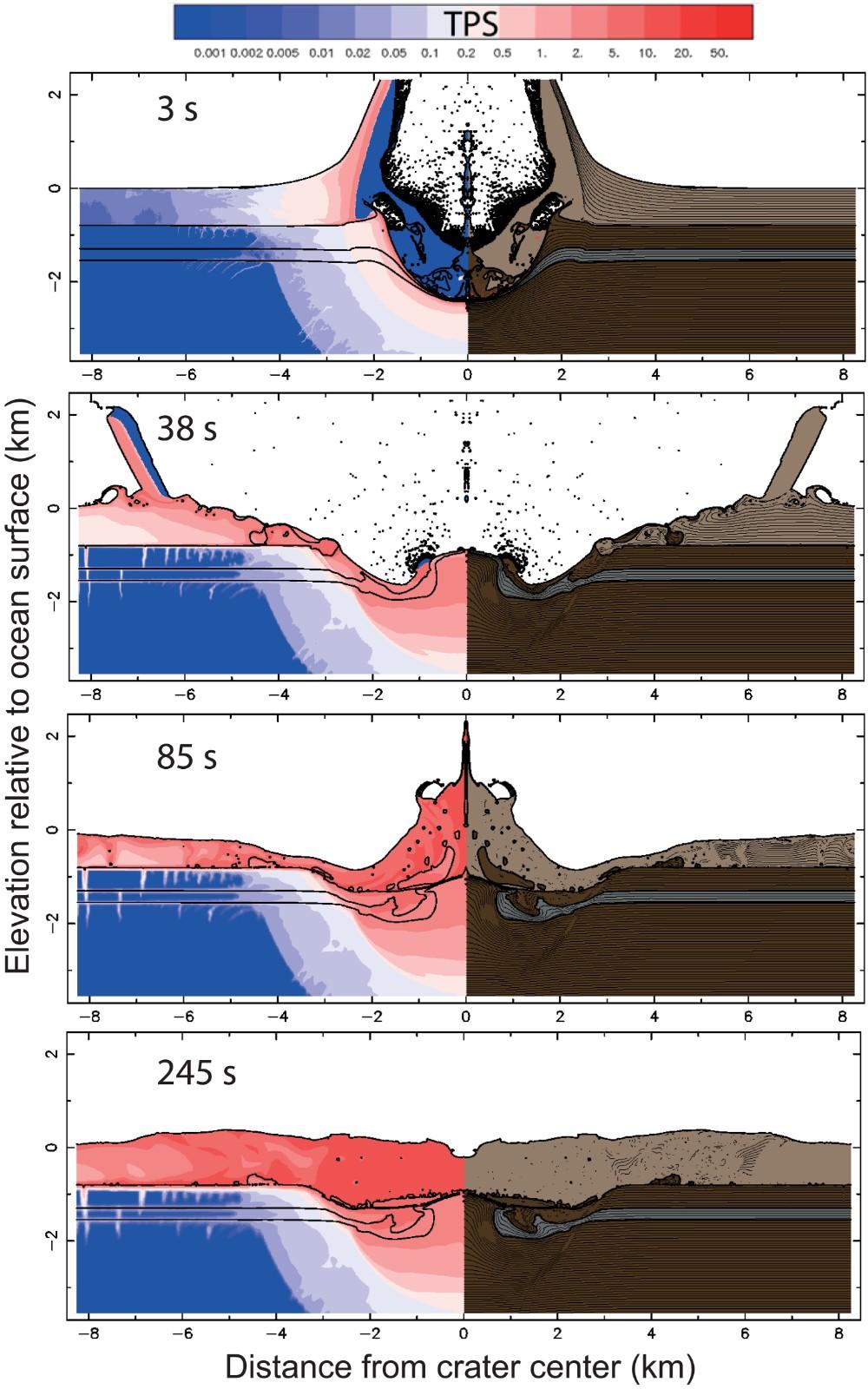 研究人员使用计算机模拟来调查什么样的撞击物在什么样的条件下会产生所看到的陨石坑,以及可能产生的落尘有多严重。他们确定负责的小行星可能直径大约有400米(1300英尺),而且它似乎撞击了490至790米(1600至2600英尺)深的水体。