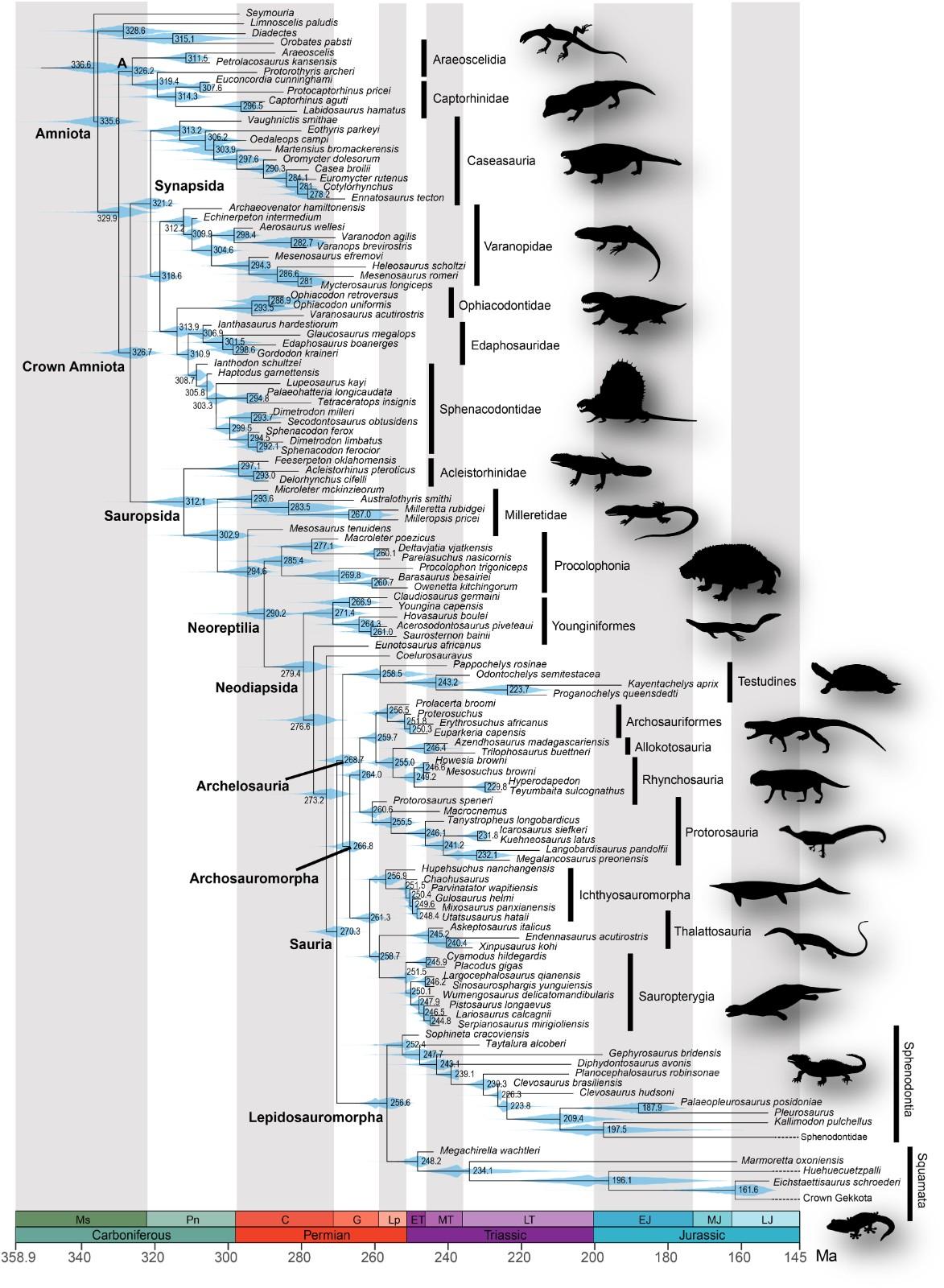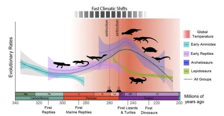 但是新研究对这一论断提出了挑战。“我们的结果显示,快速气候变化和全球变暖的时期与大多数爬行动物群体中异常高的解剖学变化率有关,因为它们适应了新的环境条件,”资深作者和哈佛大学教授Stephanie E. Pierce说。“这个过程早在二叠纪-三叠纪大灭绝之前就开始了,至少从2.7亿年前就开始了,这表明爬行动物身体计划的多样化并不像以前认为的那样是由二叠纪-三叠纪灭绝事件引发的,而实际上是在那之前几千万年就开始了。”