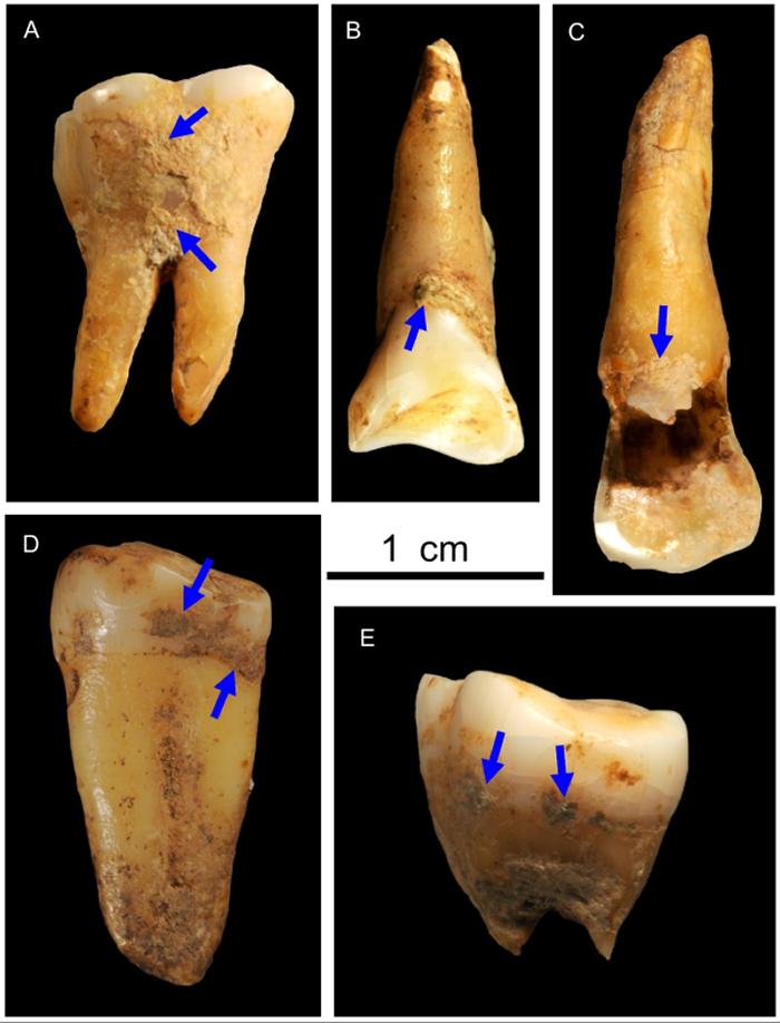 此外,研究还在牙结石内发现了来自针叶植物具缘纹孔的管胞和牙齿上观察到许多细小且平行的划痕。这些发现,与之前学者报道过的西班牙4.9万年前尼安德特人牙结石中的植物残存及划痕一致。这表明,福岩洞道县人与尼安德特人一样习惯用松柏类摩擦牙齿。这一发现揭示了东亚早期现代人就已存在可能的剔牙行为。