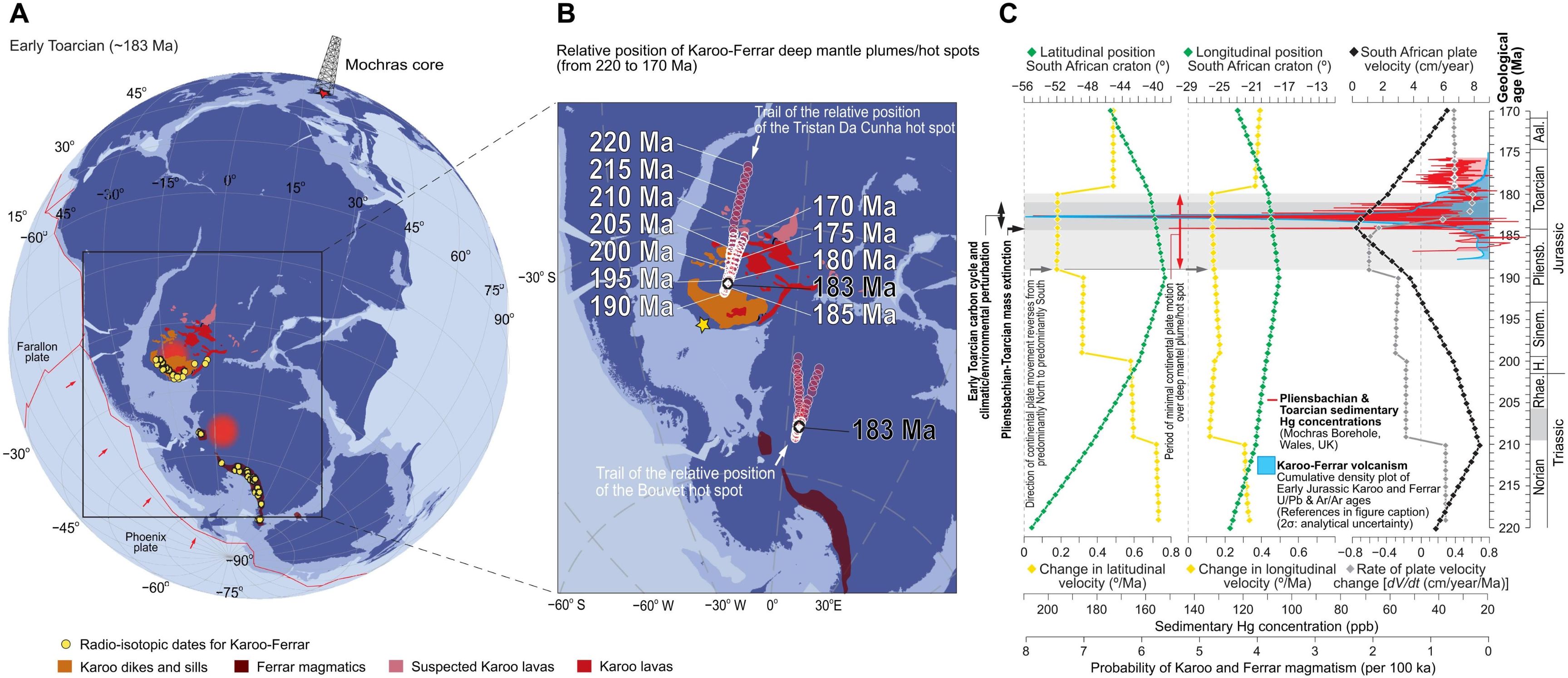 研究小组发现,这个时期的特点是一些有史以来最严重的气候和环境变化,与南半球,即目前已知的非洲南部、南极洲和澳大利亚的重大火山活动和相关的温室气体释放直接吻合。