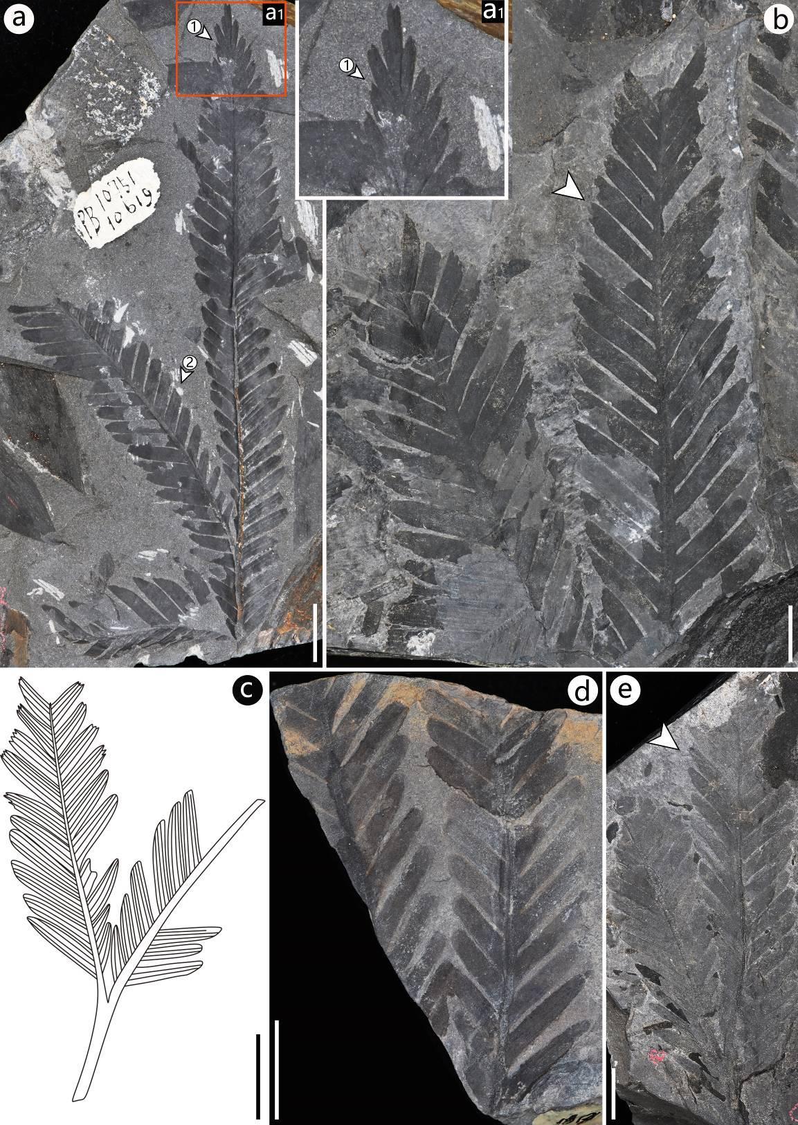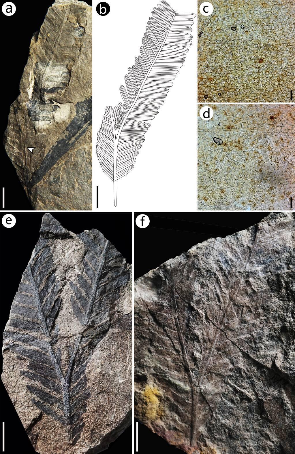 Ptilozamiteschinensis)。该植物最早发现自我国湖南,并具有重要的生物地层学和古地理学指示意义。由于过去缺少完整标本和角质层解剖构造技术,中华叉羽叶被欧洲学者并入到假篦羽叶属(