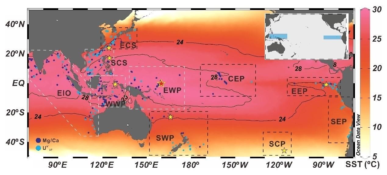近期,中国科学院南京地质古生物研究所的俞宙菲博士,与河海大学、自然资源部第一海洋研究所、中国科学院海洋研究所、同济大学、中国地质大学(武汉)、德国基尔大学等同行合作,汇编了印太暖池、热带东太平洋和亚热带南太平洋海区已发表的340组最近3万年以来的代用指标表层海水温度重建数据(包括浮游有孔虫Globigerinoides ruber壳体Mg/Ca温度和UK’37温度)和7组次表层温度数据;并利用暖池核心区KX22-4钻孔中多属种浮游有孔虫的Mg/Ca比值分析,重建了3万年以来西太暖池的热含量变化。相关研究成果于2022年9月17日在线发表于国际知名期刊《自然通讯》(Nature communications)上。
