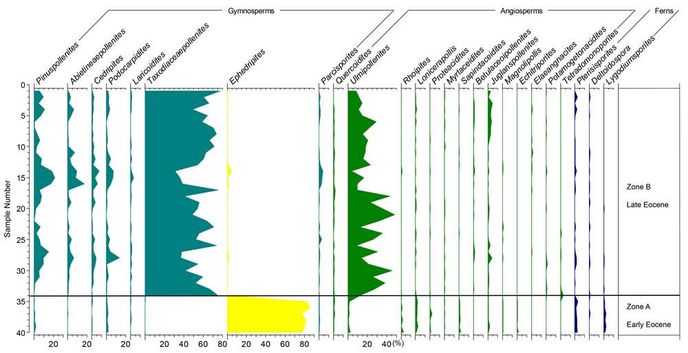 图3 清江盆地早始新世(Zone A)和晚始新世(Zone B)主要孢粉类型百分比图谱
