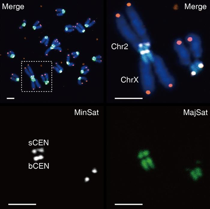 染色体着丝粒断裂融合形成了一个新的着丝粒,但是有趣的是,研究人员发现,所有和小鼠二号染色体(Chr2)发生罗氏移位之后形成的双臂染色体具有两个独立的着丝粒(MinSat富集区域)。进一步分析,研究人员发现,小鼠Chr2与其他染色体不同,在染色体末端就具有两个着丝粒。由于双着丝粒染色体会造成在有丝分裂中存在不稳定性,容易造成染色体断裂和基因组不稳定性。进一步分析发现,小鼠Chr2具有一个活化的着丝粒和一个失活的着丝粒。这一发现也暗示了小鼠Chr2染色体和其他染色体相比在进化历程中存在着特殊的着丝粒形成事件。