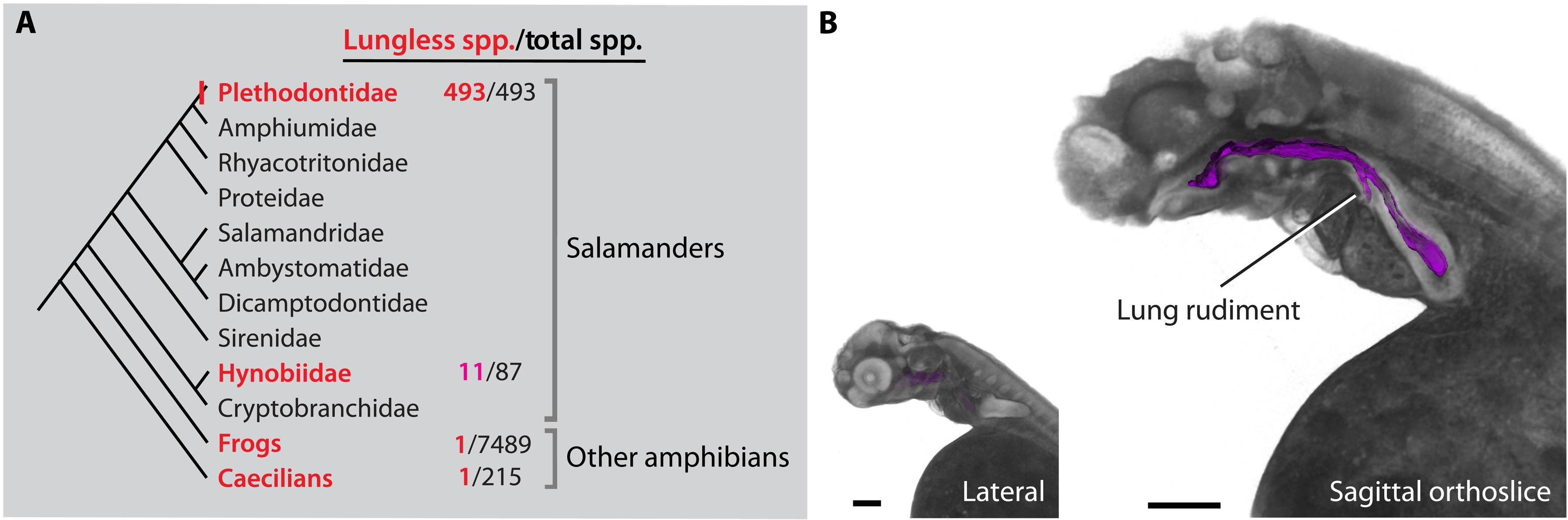 无肺螈科是物种最丰富的蝾螈科,占了目前所有蝾螈多样性的三分之二以上。所有成年的无肺螈科目动物都没有肺,只通过非肺组织呼吸,主要是皮肤和口腔及喉咙的粘膜。肺的丧失至少在远缘两栖动物中独立发生过四次,在两栖动物以及一些脊椎动物中都有更多的肺减少或丧失的案例。然而,这种损失的发展解释是未知的。