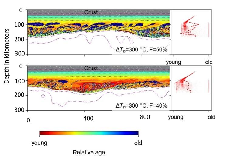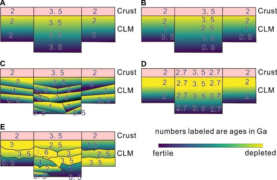 图 3. 拆沉-浮合旋回形成的古老岩石圈底垫于新岩石圈之下或镶嵌于新岩石圈内部的模型实例。拆沉-浮合旋回可以产生不同类型的岩石圈成分和年龄结构(详情参见原文),可以合理解释深源岩浆岩和捕虏体所反映的不同地区的岩石圈成分和年龄结构。