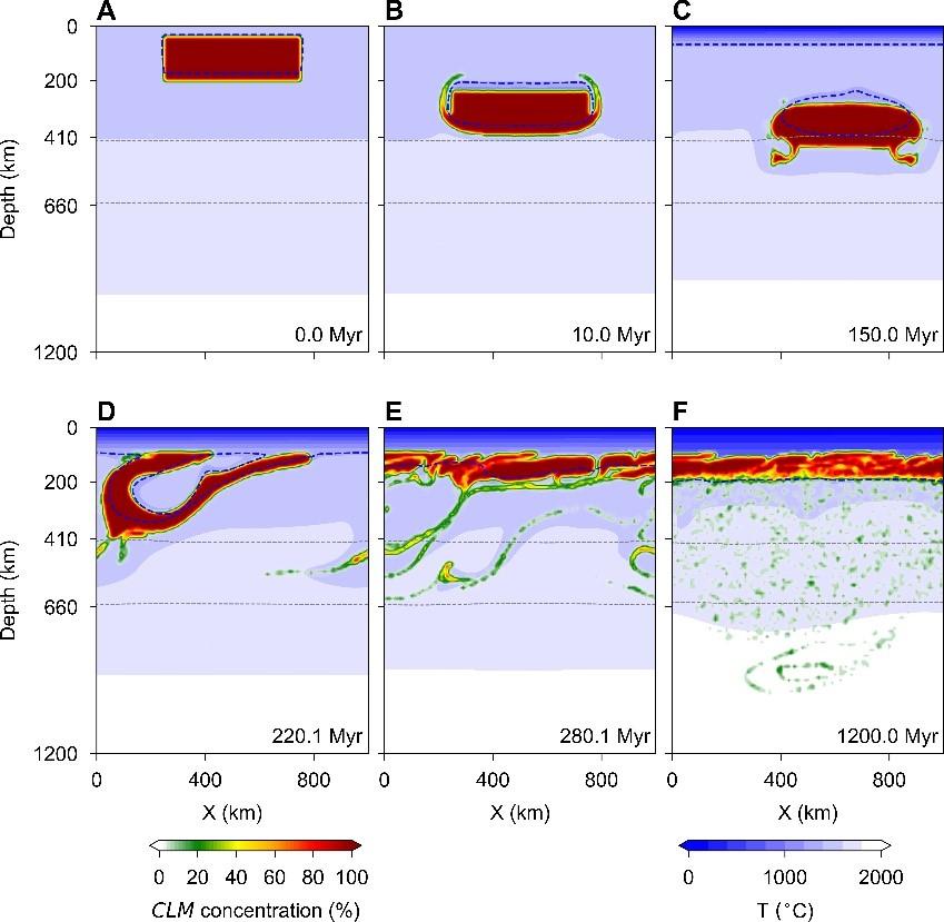 地球早期地幔温度高,高程度部分熔融导致残余的地幔亏损程度较高,因此具有化学成分控制的高浮力(产生向上的正浮力),逐渐聚集在地球浅部。随着地表低温热边界层的向下生长,熔融残余的温度变低,形成高粘度岩石圈。低温产生的冷缩效应会导致密度显著增加,因此产生向下的负浮力。该作用逐渐抵消化学成分相关的正浮力,从而使冷岩石圈失稳和向深部沉没,被称为拆沉作用(图2 A-C)。拆沉的岩石圈进入地幔后,被地幔高温加热,使得温度产生的负浮力逐渐被化学成分浮力超越,反而抑制下沉,导致被加热的古老熔融残余物质上浮(图2 D),并再度合并到浅部的岩石圈底部(图2 E-F)。拆沉和上浮之间的时间间隔可以长达数千万年到数亿年不等。在这期间,浅部岩石圈在板块构造运动驱动下可发生数千公里移动,深部的古老岩石圈残片也可以在地幔流驱动下发生大规模水平位移。因此上浮的岩石圈残片可以合并到不同年龄的克拉通、造山带或者大洋岩石圈底部形成复杂的岩石圈结构。