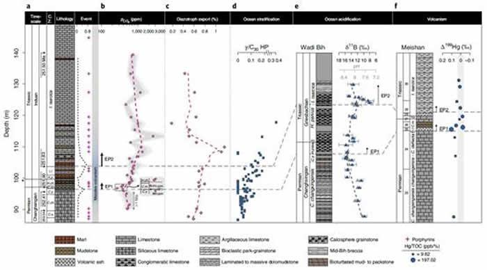 针对该时期的气候变化,沈佳恒研究员利用远古叶绿素的生物标志化合物单体碳同位素定量重建了该时期的大气二氧化碳浓度。重建结果显示第一幕灭绝,pCO2最低;随后pCO2快速上升,步入缓慢上升期,此高pCO2一直持续至早三叠世的第二幕灭绝,并达到最高值;之后pCO2开始缓慢下降。此重建结果详细刻画出了两幕灭绝时不同的pCO2特征。生物标志化合物单体氮同位素被用于定量重建该时期海洋初级生产力群落结构(细菌及真核生物)的演化。重建结果显示第一幕灭绝时,海洋初级生产群落以真核藻类(eukaryotes)为主;而第二幕灭绝时,蓝细菌(cyanobacteria)则以绝对优势~100%全面占据海洋初级生产群落。