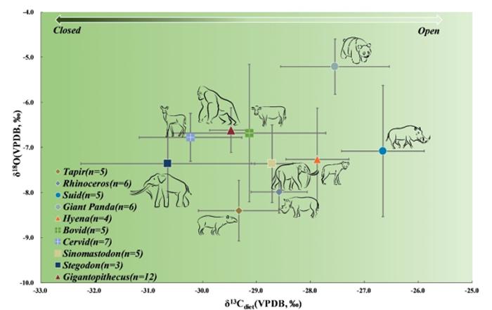 图1 广西柳城巨猿动物群牙釉质稳定碳氧同位素分析