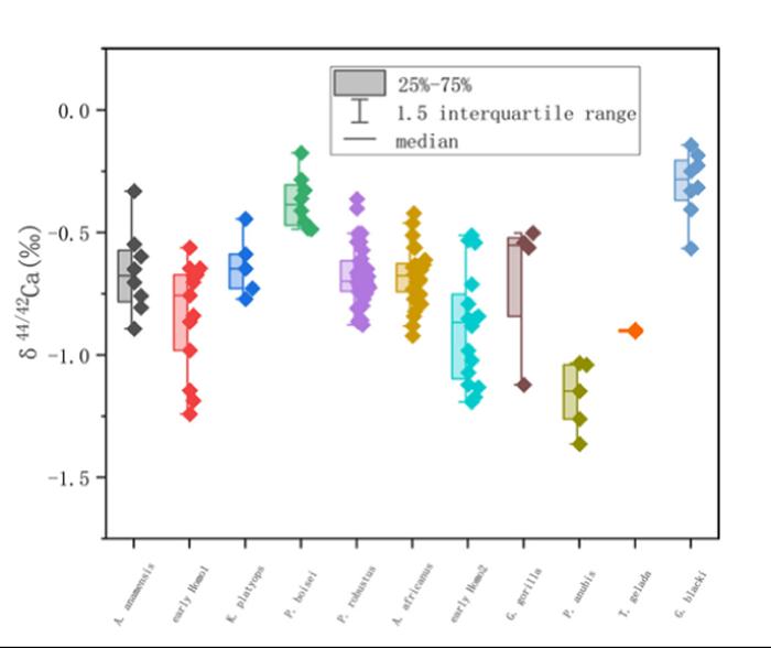 除此之外,本研究还将巨猿的钙同位素值δ44/42Ca与之前已发表的其他的古人类(包括早期人属、南方古猿、傍人、现代灵长类动物等)进行了比较分析(图4)。研究发现:巨猿与傍人鲍氏种(