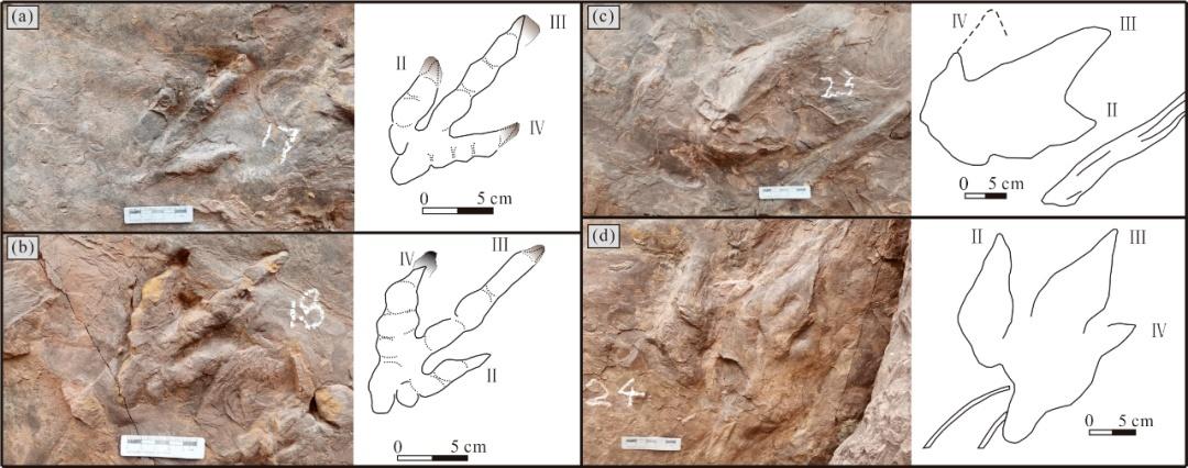 足迹化石照片(a-b:阿涅塘跷脚龙;c-d:属种未定兽脚类足迹)