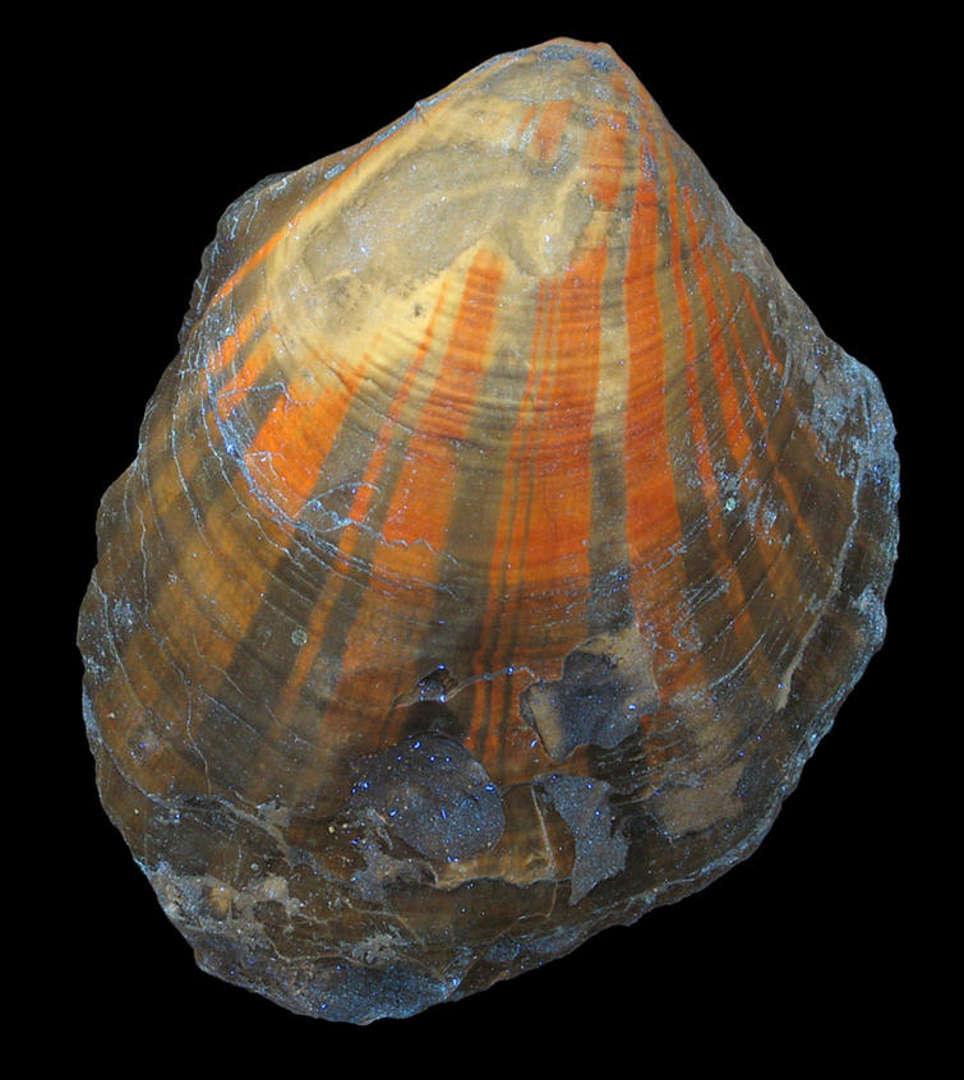 在中生代时代的化石中,颜色图案的痕迹极为罕见。然而,对三叠纪时代--就在中生代的开始--的扇贝进行的紫外线检查显示,颜色图案的保存比以前认为的要多得多。人眼无法察觉的紫外线激发了化石中的有机化合物,使其发光。这暴露了令人惊讶的各种颜色图案,包括许多种类的条纹、人字形和火焰图案。颜色图案的多样性可与在海滩上看到的现代贝壳相媲美。