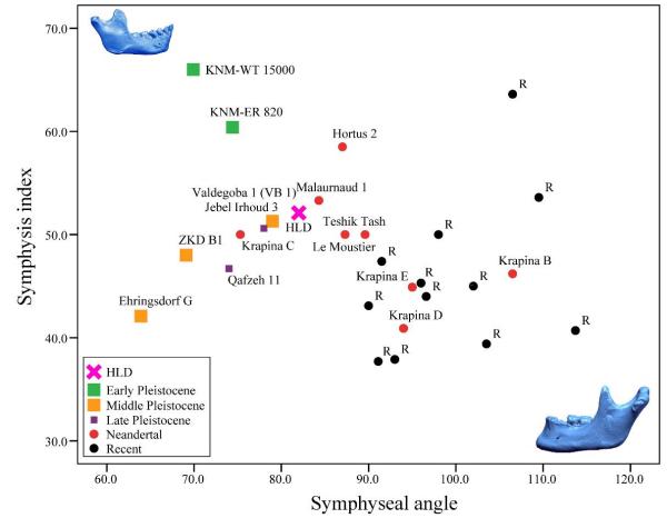 图2. 华龙洞个体和未成年对照组标本下颌骨联合部倾角及其粗壮度指数双变量分析结果,显示华龙洞人位于中更新世、晚更新世、尼安德特人和现代人之间。