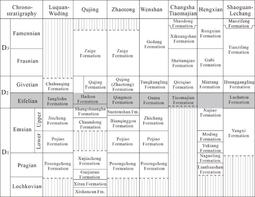 在详细研究茶花箐鱼的基础上,结合在禄劝地区泥盆系中的地质考察及发现的其它鱼类与无脊椎动物化石材料,课题组对产出沟鳞鱼类茶花箐鱼的地层层位及地质时代提出了新的含鱼地层框架,并基于鱼化石组合面貌的研究分析,提出了华南地区中泥盆世含鱼地层的对比方案。禄劝地区产出茶花箐鱼的地层主要以细砂岩为主、夹页岩及泥灰岩,是一套位于早泥盆世埃姆斯晚期旧城组黑色页岩层之上、中泥盆世吉维特期含丰富腕足类Stringocephalus的茶花箐组瘤状泥灰岩之下的碎屑岩地层,综合前人认识将其称为棠梨树组(源自赵秀琨于1978年所命名的鱼子甸组下部的棠梨树段),地质时代归属中泥盆世艾菲尔期(图4)。茶花箐鱼连同共生的其它胴甲鱼均是中泥盆世海口动物群Bothriolepis sinensis-Hunanolepis组合的代表分子,藉此将华南地区相关含鱼地层直接对比起来,禄劝-武定地区的棠梨树组与湖南的跳马涧组、云南曲靖地区的上双河组+海口组中下部以及广东的老虎头组等不仅层位相当、可横向对比,而且均为中泥盆世艾菲尔期的沉积(图4)。