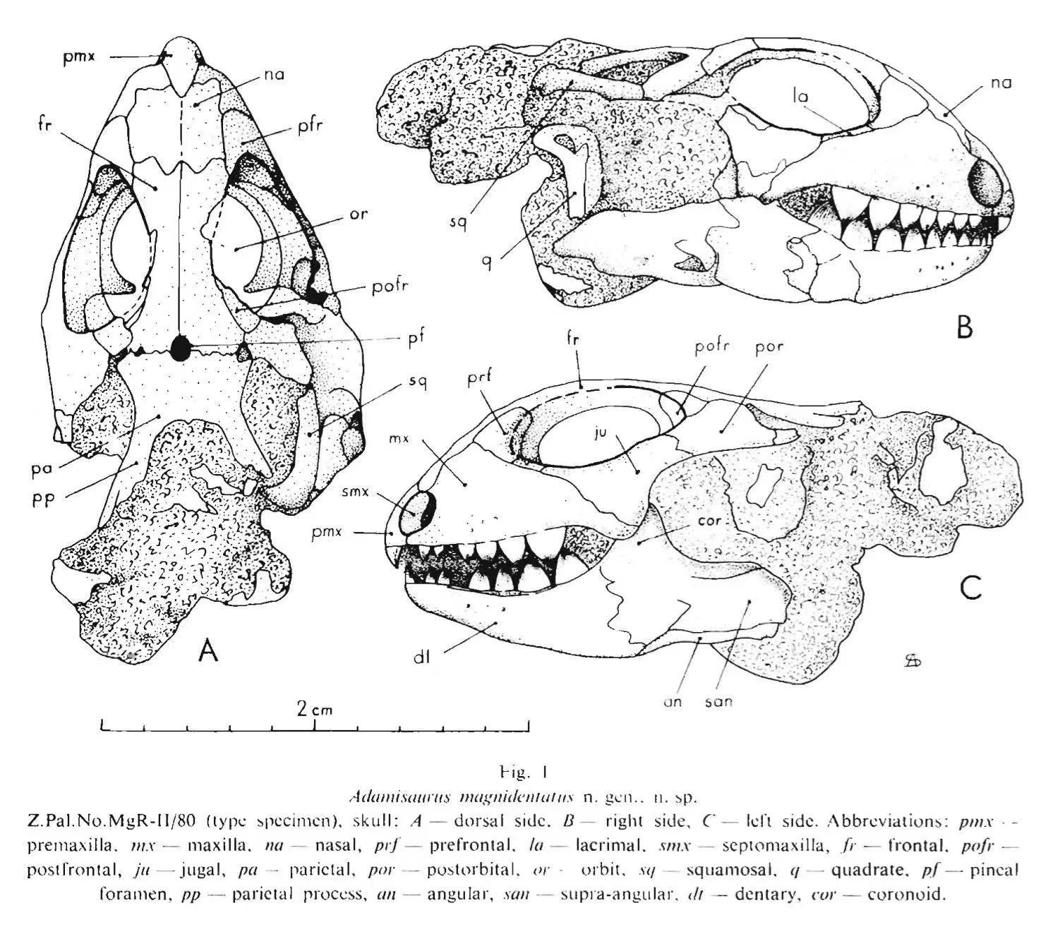 经中国科学院古脊椎动物与古人类研究所董丽萍副研究员鉴定,该头骨化石为硕齿亚当蜥的头骨化石。硕齿亚当蜥最早由波兰—蒙古古生物考察团于 1964-1970 年间在蒙古戈壁沙漠晚白垩世砂岩地层中采集到。Sulimski于1972年对其带下颌的不完整头骨进行了初步的描述,建立了亚当蜥属,并根据其“牙齿硕大”这一显著特征对其进行了命名。硕齿亚当蜥是一种生存于距今8300万年-7200万年的白垩纪晚期的陆生古蜥蜴。