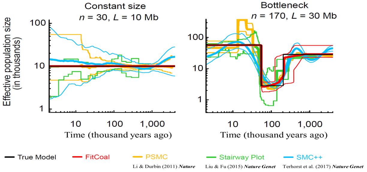 图1. FitCoal、PSMC、Stairway Plot和SMC++估计的群体历史