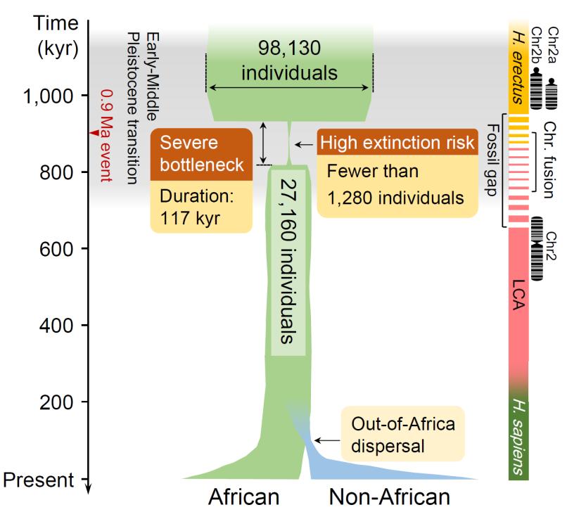 这一严重的远古群体瓶颈,恰好与非洲人类祖先化石的缺失环节、非洲直立人(Homo erectus)化石的消失、新的古人类物种(LCA)的形成、两条古人类2号染色体的融合阶段相对应(图2)。进一步,这说明早、中更新世过渡期严重的群体瓶颈对人类进化具有关键影响,可能决定了现代人类许多关键表型的形成。同时,这一远古时期群体数量的衰减,降低了65.85%现代人群的遗传多样性,对人类生命和健康产生了深远影响。