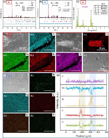 图2 K1和K2样品的XRD、SEM和EDS分析图