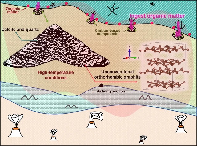 中国科学院南京地质古生物研究所盛青怡副研究员和许艺炜博士通过X射线衍射(XRD)、扫描电镜(SEM)、能谱分析(EDS)和拉曼光谱等技术,对西藏阿章剖面白垩世郎山组下部和上部的有孔虫化石(K1和K2样品)进行对比分析。研究材料是西藏白垩纪的一类有孔虫——圆笠虫,这是白垩纪中期广泛分布、演化迅速的一类海相底栖大有孔虫,对地层划分起关键作用。K1样品采自白垩纪阿普特晚期,K2样品采自白垩纪赛诺曼早期。首次在K1样品中发现了非常规正交晶系石墨,其形成可能与白垩纪中期火山活动引发的高温高压环境有关。SEM和拉曼光谱进一步证实其层状结构与碳富集特征,而K2样品仅含方解石和石英,未检测到石墨残留。理论计算表明正交相石墨能量高于常规六方石墨,暗示其形成依赖瞬时极端条件。白垩纪中期1.1亿年前即阿尔布早期火山活动很活跃,之后相对平静。样品K1采自1.1亿年前,K2采自1.1亿年之后。推测K1中有孔虫体内形成的非常规正交晶系石墨可能与1.1亿年前活跃的火山活动相关。