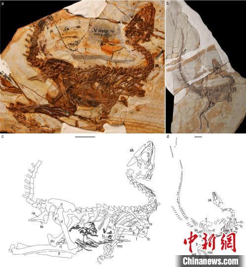 中国华诞龙(a , c)和凌源中华鸟龙(b , d)正型标本及线条图。(中国科学院古脊椎所 供图)
