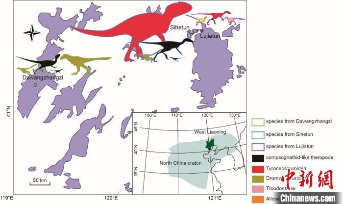 辽西热河生物群主要化石产地的兽脚类恐龙物种组成示意图。(中国科学院古脊椎所 供图)