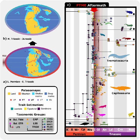 为了了解离片椎类的生态变化,研究人员分析了生活在三叠纪期间的100种离片椎类的数据,测量了它们的体型、头骨和牙齿特征,以推测其功能和生活方式。研究发现,在危机时期,它们的体型范围与二叠纪时期基本一致:一些体型较小的个体以昆虫为食,而另一些体型较大的个体演化出长嘴或宽嘴,分别用于捕捉鱼类或作为杂食性捕食者。有趣的是,它们的体型和功能性多样性在危机后约500万年达到高峰,但随后又逐渐回落。