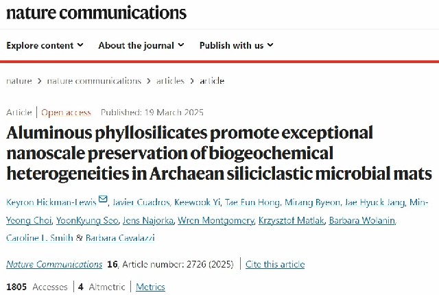 原文来源:Hickman-Lewis K,Cuadros J,Yi K,et al.,2025. Aluminous phyllosilicates promote exceptional nanoscale preservation of biogeochemical heterogeneities in Archean siliciclastic microbial mats. Nature Communications,16,2726.